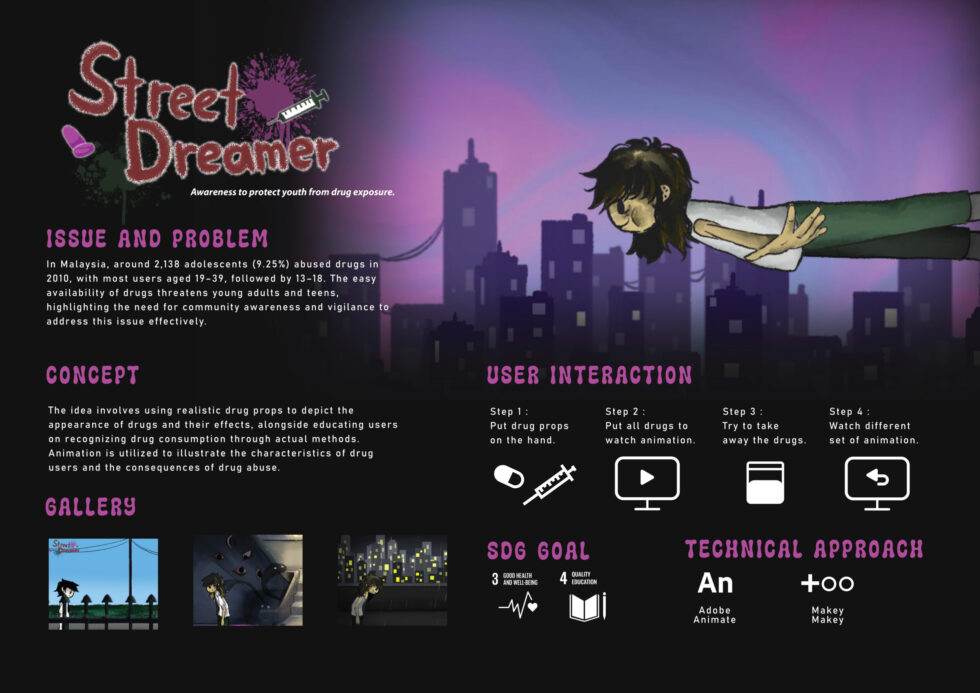 “Street Dreamer” is an interactive installation designed to raise awareness about drug exposure and abuse among Malaysian adolescents and young adults. Using realistic drug props and animations, the project educates users on recognising drug use and understanding its consequences. Through an engaging interactive experience, participants learn about the effects and dangers of drug abuse, promoting community awareness and preventive action.